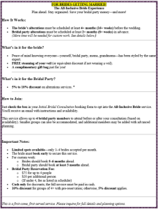 (Please note Full Day and LUXURY Day Service requires 50% deposit at time of contract with balance paid in full on or before the 30th day prior to the wedding. Includes hand/machine repairs as time permits for bride and her bridal party plus groomsmen, if elected. No refunds on deposit and refunds as noted in contract after final payment. Timeline determined by ceremony. Regular alterations not permitted – see contract. If additional garments needing to be steamed from what is listed, there will need to be an hour add-on for every 1-4 garments needed. Meal required and must be served with photographer and videographer so we can optimize your picture time when you are done eating.)